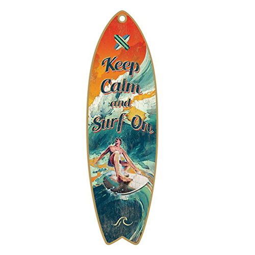 This surfer-adorned board reads: Keep Clam And Surf On. Makes a really perfect addition to tropical, coastal, Hawaiian or beach themed décor!