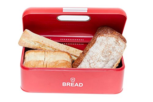Vintage Bread Box For Kitchen Stainless Steel Metal 16.5″ x 9″ x 6.5″ with viewing window + FREE Bread Bag; Large Bread, Loaves, Pasgtires Bin storage (Red)