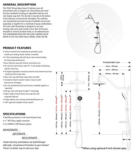 The Kauai Rain Shower System is brilliantly simple! Designed to make use of your existing valve, it replaces the old showerhead with an elegant rain showerhead and multi-serve as hand shower. The integrated brass slide bar allows adjustable height keep an eye on for the hand shower and brass soap dish even as providing a conveniently situated diverter for switching functions. Surface mounted and completely pre-plumbed. Easily retrofit your existing shower with no remodel. Typical install is lower than 1 hour-even for the do it yourselfer. It simply connects to water supply at your existing showerhead location and uses your existing hot/cold shower valve. Connects to water supply with included 1/2″ NPT Brass nipple. Has backflow protection within the hand shower hose. Manufacturer’s three year limited warranty.
