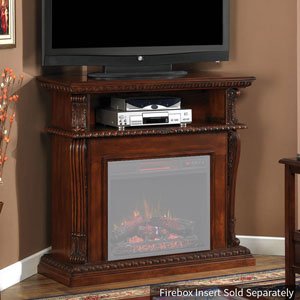 This flexible dual TV stand fits in a corner or against a wall. The egg and dart molding of the Corinth gives this multifunction TV stand a traditional look that enhances a ClassicFlame 23″ electric fireplace insert (sold one after the other). The beveled base with decorative swag molding add drama when combined with the carved leaf corbels with acanthus crowns. Simple, hassle-free assembly with only a Phillips head screwdriver.