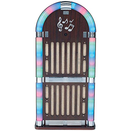 This Sylvania Nostalgia Bluetooth Jukebox is the right thing to get your party began! Sylvania is World renowned for quality products and this Jukebox is sure not to disappoint. The sturdy build and multi-color lights makes this Bluetooth Jukebox one of a kind. Not only is this Sylvania Jukebox well-built but it comes with an Auxiliary input to play music from any audio device, FM Radio and a 20W Speaker! Use this amazing Jukebox at parties or in your play room! The classic wooden finish will delight all. the changing colors will provide a serene and nostalgic environment. This is powered by an AC adapter (included). with a 4 piece Hi-Fi speaker set built in and Electronic Volume Keep watch over, the sound quality is outstanding and you’re going to love entertaining your friends and family at your next gathering. In case you are in search of the very best music system for a den, workplace, circle of relatives room or a perfect gift for Dad, look no further as this Bluetooth Juke-Box will wow everyone!