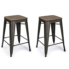 Adeco 24-inch Metal Counter Stools, Vintage Wood Seat Top Chair, Black Bronze (Set of Two)